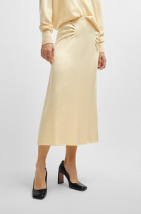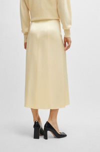 SIZE AND FIT The model wears a size 4 and is 5'9" tall with a, 33" chest, 25" waist and 36" hips. DETAILS Vaniki - 50508440 A high-waisted A-line skirt by BOSS Womenswear, cut to a straight fit in smooth fabric with flattering gathered details at the front. Regular fit High rise A-line skirt Zip closure Fit back length: 85 cm (33 inches) QUALITY & CARE INSTRUCTIONS Do Not Tumble Dry Quality: 72% Acetate, 28% Viscose Do Not Bleach Do Not Wash Iron Low Heat Reduced Dry Clean