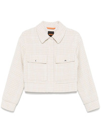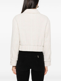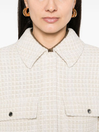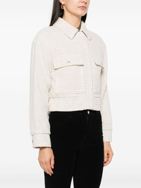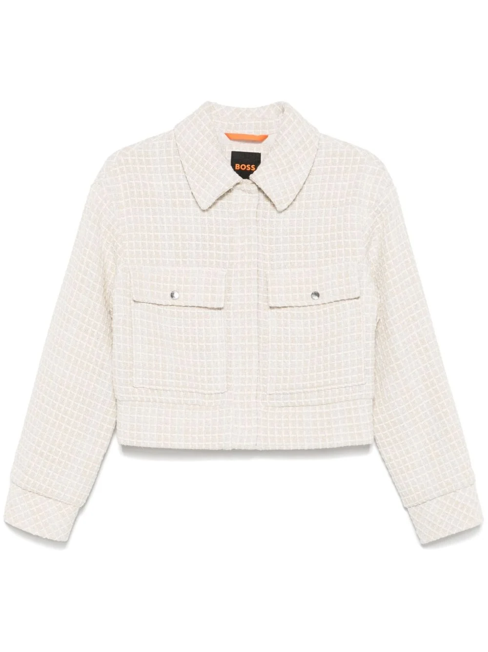 interwoven-design jacket Highlights - Light beige/cream white - Recycled cotton blend - Interwoven design - Front press-stud fastening - Classic collar - Long sleeves - Press-stud fastening cuffs - Two chest flap pockets - Full lining - Rear elasticated hem Imported Composition Outer: Recycled Cotton 62%, Polyester 22%, Other fibres 7%, Polyacrylic 6%, Viscose 3% Lining: Viscose 100% SIZE & FIT Model measurements Height 5 ft 11 in(1.8 m) Bust/Chest 33.07 in(84 cm) Hips 37.4 in(95 cm) Waist 25.19 in(64 cm) FittingInformation Designed for a relaxed fit, this piece allows for comfort and movement when worn The elasticated hem allows for movement and a comfortable fit Made from a midweight non-stretch fabric