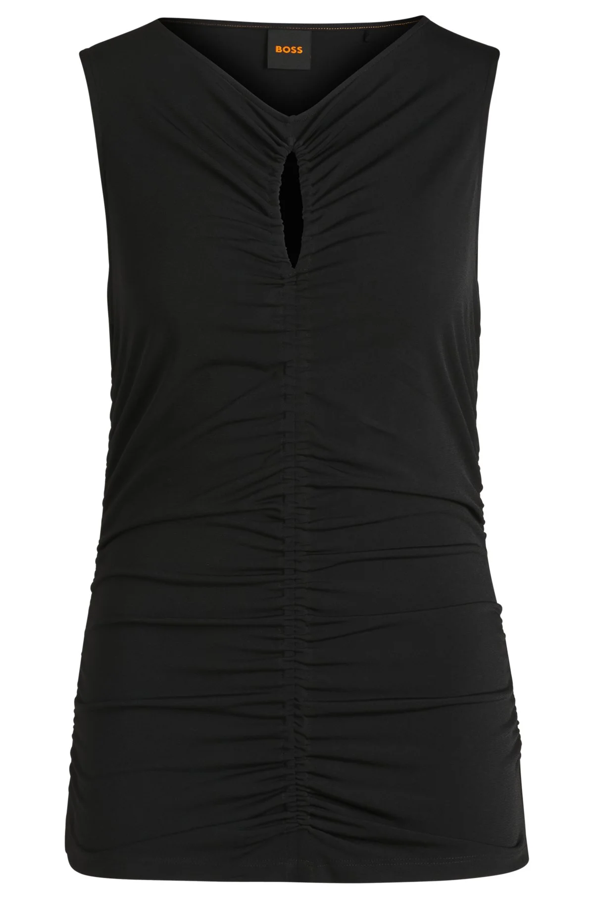 SIZE AND FIT The model wears a size S and is 5'10" tall with a, 31" chest, 24" waist and 35" hips. DETAILS C_Emacha - 50540913 With elegant gathering and a cut-out feature, this sleeveless BOSS Womenswear top is made in comfortable stretch fabric. Logo charm at the back neck. Regular fit Neckline: Crew neck Fastening top: Slip-on Sleeveless Front slit Unlined Fit back length: 57 cm (22 inches) QUALITY & CARE INSTRUCTIONS Do Not Tumble Dry Machine Wash Cold Gentle Iron Low Heat Quality: 95% Polyester, 5% Elastane Do Not Bleach Do Not Dry Clean