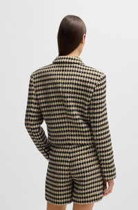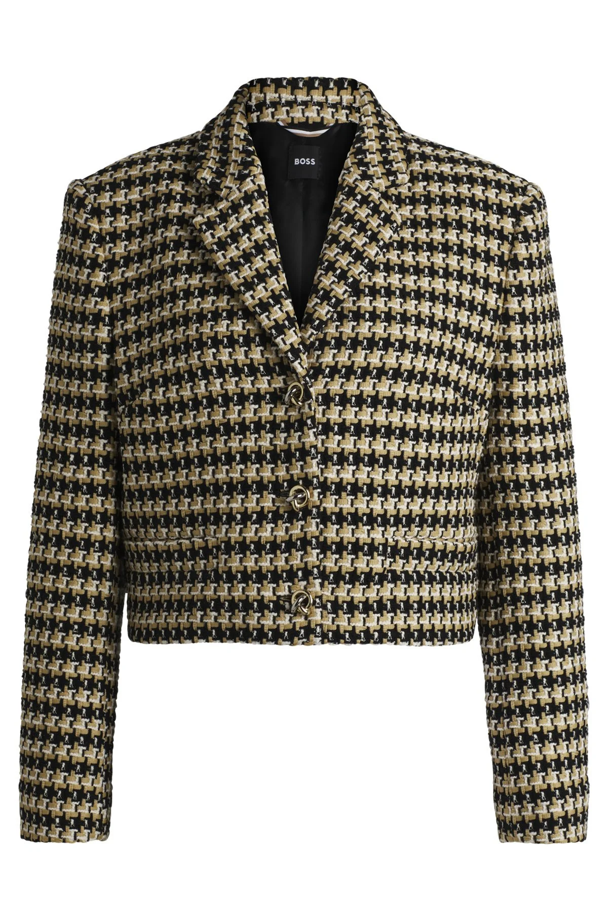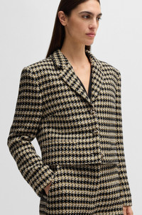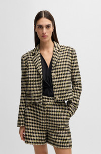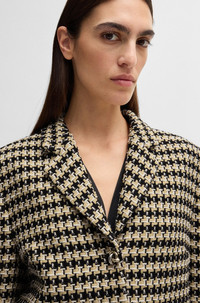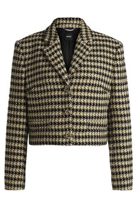 SIZE AND FIT The model wears a size 4 and is 5'9" tall with a, 31" chest, 24" waist and 35" hips. DETAILS Jolenal - 50531492 In tweed with a cropped length, BOSS Womenswear’s regular-fit jacket adds impact to an office look. Cotton, knot buttons in gold-tone metal. Regular fit Notched lapels Fastening top: Button closure Number of buttons: 3 Pockets top: Welt pockets Fully lined Fit back length: 48 cm (19 inches) QUALITY & CARE INSTRUCTIONS Reduced Dry Clean Do Not Bleach Do Not Tumble Dry Quality: 60% Cotton, 26% Polyester, 11% Polyacrylic, 3% Other fibres, Lining: 55% Polyester, 45% Viscose Do Not Wash Iron Low Heat