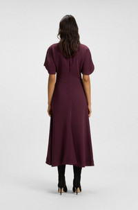 SIZE AND FIT The model wears a size 4 and is 5'10" tall with a, 33" chest, 23" waist and 34" hips. DETAILS Denaz - 50546587 An effortless daywear piece, this BOSS Womenswear dress has a V neckline with a modern keyhole detail. In floaty crepe with topstitching. Regular fit Neckline: V-neck Fastening top: Zip and hook closure Short sleeves No cuffs Fit back length: 135 cm (53 inches) QUALITY & CARE INSTRUCTIONS Do Not Tumble Dry Reduced Dry Clean Iron Low Heat Quality: 97% Viscose, 3% Elastane Do Not Wash Do Not Bleach