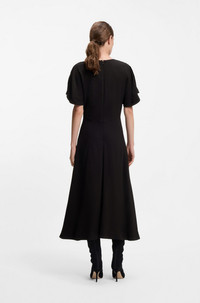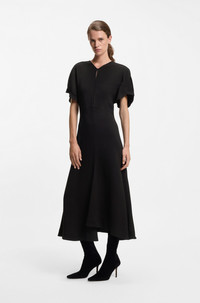 DETAILS An effortless daywear piece, this BOSS Womenswear dress has a V neckline with a modern keyhole detail. In floaty crepe with topstitching. Regular fit Neckline: V-neck Fastening top: Zip and hook closure Short sleeves No cuffs Fit back length: 135 cm (53 inches) Denaz - 50546587 QUALITY & CARE INSTRUCTIONS Reduced Dry Clean Iron Low Heat Do Not Tumble Dry Do Not Bleach Do Not Wash Material: 97% Viscose, 3% Elastane