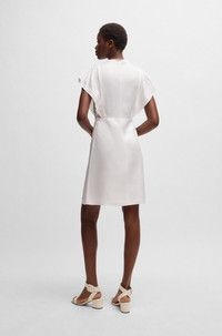 SIZE AND FIT The model wears a size 4 and is 5'10" tall with a, 31" chest, 24" waist and 35" hips. DETAILS Deliniara - 50537402 Build effortless summer looks with this BOSS Womenswear dress. Blended with linen for a fresh feel, this dress features frills at the sleeves. Regular fit Neckline: Crew neck Fastening top: Side zip closure Short sleeves Partially lined Fit back length: 95 cm (37 inches) QUALITY & CARE INSTRUCTIONS Do Not Wash Quality: 59% Viscose, 41% Linen, Lining: 64% Viscose, 36% Polyester Do Not Tumble Dry Iron Low Heat Do Not Bleach Reduced Dry Clean