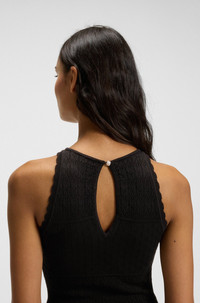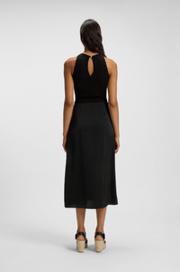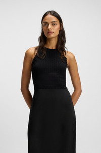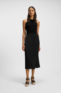 DETAILS C_Fawrence - 50538314 In a mix of softly woven fabric and a structured knit, this sleeveless BOSS Womenswear dress creates a contemporary silhouette. Logo charm for subtle branding. Fit back length: 124 cm (49 inches) QUALITY & CARE INSTRUCTIONS Hand Wash Only Iron Low Heat Quality: 72% Viscose, 28% Polyester, Skirt: 100% Polyester Do Not Bleach Do Not Tumble Dry Do Not Dry Clean