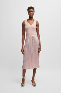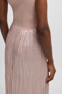 SIZE AND FIT The model wears a size S and is 5'11" tall with a, 31" chest, 23" waist and 34" hips. DETAILS Fernani - 50537736 Designed in tonal fabrics for an interesting effect, this BOSS Womenswear dress features a plunging V neckline. Ribbed, form-fitting bodice. Shimmering structured skirt. Slim fit Neckline: V-neck Sleeveless Fit back length: 120 cm (47 inches) QUALITY & CARE INSTRUCTIONS Do Not Bleach Do Not Tumble Dry Hand Wash Only Quality: 68% Viscose, 30% Polyamid, 2% Elastane, Skirt: 100% Polyester (60% recycled) Dry Clean Only Iron Low Heat