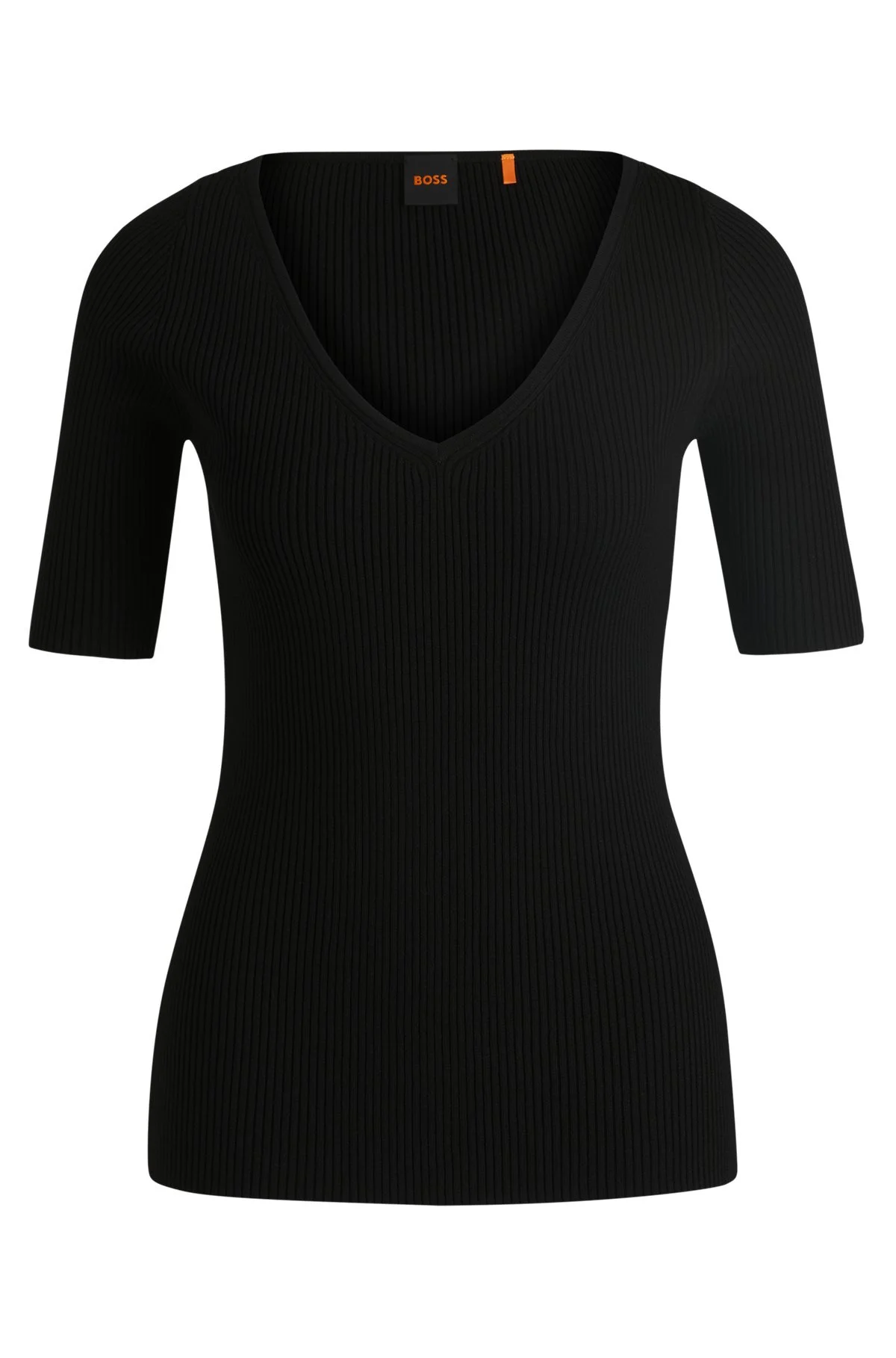 SIZE AND FIT The model wears a size S and is 5'10" tall with a, 31" chest, 24" waist and 35" hips. DETAILS C_Faradisco - 50534829 A versatile short-sleeved sweater by BOSS. This slim-fitting piece is knitted in a stretch blend and topped with a V neckline. Slim fit QUALITY & CARE INSTRUCTIONS Hand Wash Only Quality: 72% Viscose, 28% Polyester Do Not Tumble Dry Do Not Bleach Iron Low Heat Do Not Dry Clean