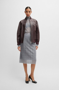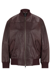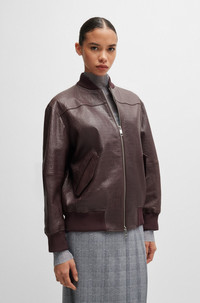 SIZE AND FIT The model wears a size 4 and is 5'10" tall with a, 31" chest, 24" waist and 35" hips. DETAILS Sabombari1 - 50521929 A modern bomber jacket in leather with knitted trims by BOSS Womenswear. This piece is embossed all over with a crocodile motif for contemporary appeal. Fit back length: 65 cm (26 inches) QUALITY & CARE INSTRUCTIONS Quality: 100% Lamb leather, Cuff: 98% Polyamid, 2% Elastane, Sleeve lining: 100% Polyester, Body Lining: 54% Polyester, 46% Viscose, Cuff / Waistband / Collar: 98% Polyamid, 2% Elastane Do Not Tumble Dry Do Not Bleach Do Not Iron Do Not Wash Reduced Dry Clean