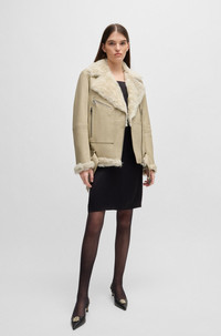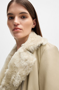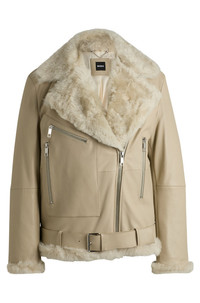 SIZE AND FIT The model wears a size 2 and is 5'10" tall with a, 31" chest, 24" waist and 35" hips. DETAILS Sabbina - 50524016 A statement jacket by BOSS. Featuring tonal sheepskin trims for a plush feel, this piece is crafted in soft leather with branded accents. Fit back length: 63 cm (25 inches) QUALITY & CARE INSTRUCTIONS Do Not Tumble Dry Do Not Iron Quality: 100% Lamb leather, Lining: 54% Polyester, 46% Viscose, Filling: 100% Polyester, Sleeve: 100% Polyester, Collar: 100% Sheepskin Do Not Wash Do Not Bleach Reduced Dry Clean