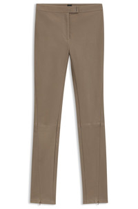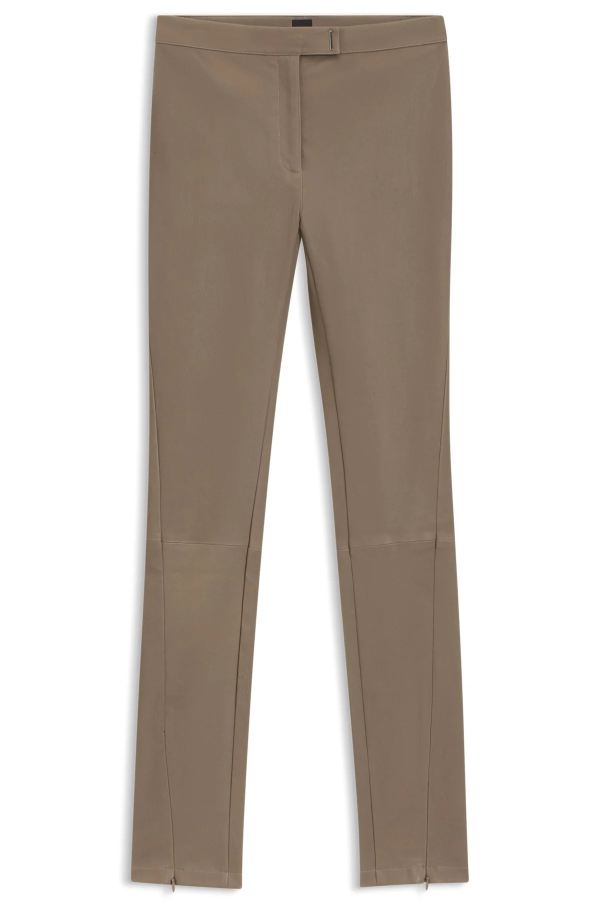 SIZE AND FIT The model wears a size 4 and is 5'10" tall with a, 31" chest, 24" waist and 35" hips. DETAILS Simax - 50541926 Cut in stretchy leather with zipped hems, these BOSS Womenswear leggings will kick off a variety of everyday looks. Hook closure with logo detail. Slim fit Fit foot width: 15,0 cm (5.9 inches) QUALITY & CARE INSTRUCTIONS Do Not Tumble Dry Do Not Iron Do Not Bleach Do Not Wash Reduced Dry Clean Quality: 100% Lamb leather