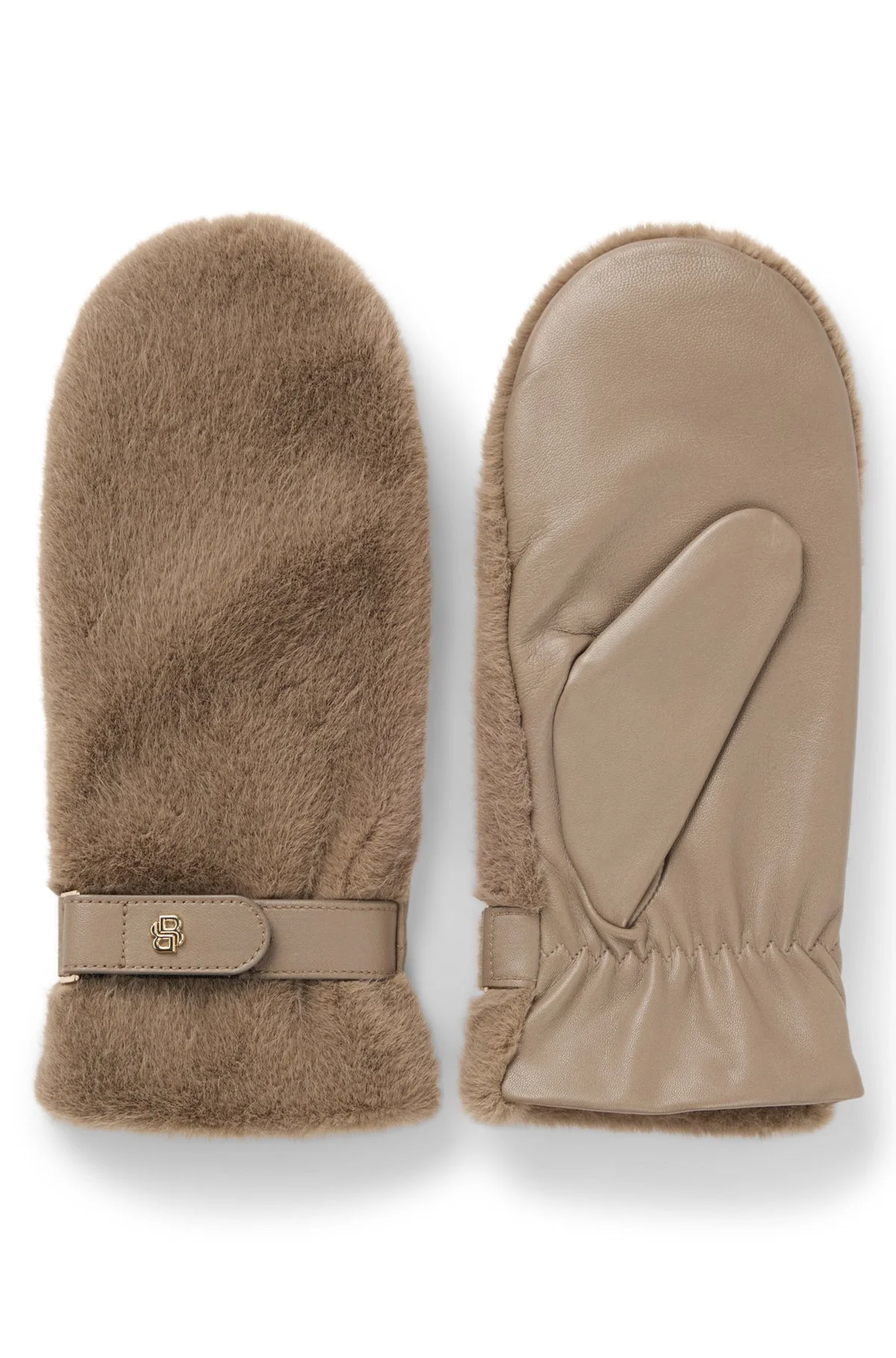DETAILS Combining plush faux fur and supple leather, these BOSS Womenswear mittens make a chic winter statement. Double B monogram rivet. Strap detail. Yosie-F - 50551632 QUALITY & CARE INSTRUCTIONS Do Not Bleach Do Not Dry Clean Material: 100% Lamb leather, Lining: 100% Polyester, Front panel: 100% Polyester Do Not Tumble Dry Do Not Wash Do Not Iron