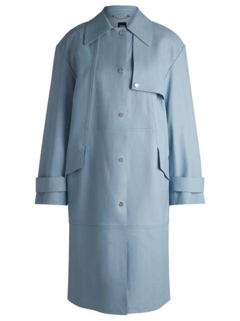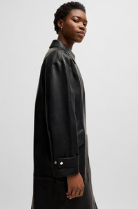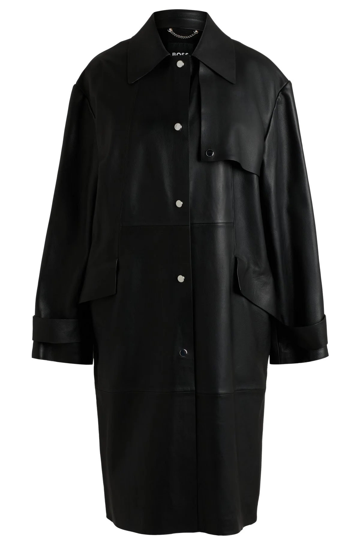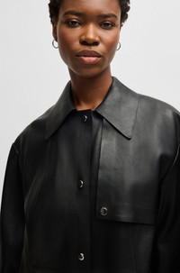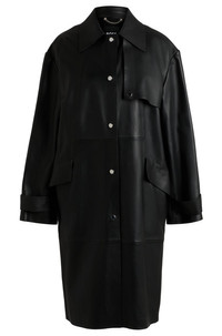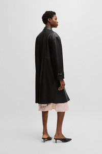 SIZE AND FIT The model wears a size 4 and is 5'11" tall with a, 31" chest, 23" waist and 34" hips. DETAILS Sondeli - 50531308 With raw-edge workmanship and polished trims, this elegant trench coat from BOSS Womenswear is perfect for a weekend getaway. Cut in super-soft leather. Fit back length: 105 cm (41 inches) QUALITY & CARE INSTRUCTIONS Quality: 100% Lamb leather, Facing: 100% Goat leather Do Not Tumble Dry Do Not Bleach Do Not Iron Do Not Wash Reduced Dry Clean