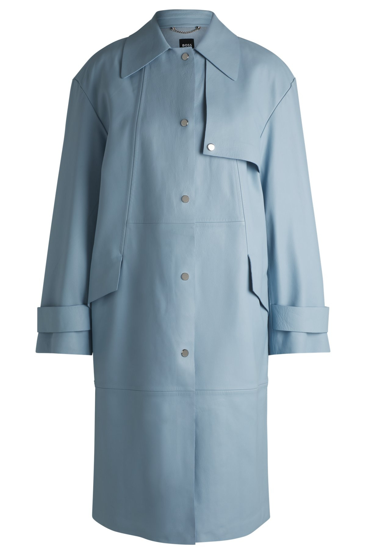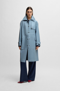 SIZE AND FIT The model wears a size 4 and is 5'9" tall with a, 31" chest, 24" waist and 35" hips. DETAILS Sondeli - 50531308 With raw-edge workmanship and polished trims, this elegant trench coat from BOSS Womenswear is perfect for a weekend getaway. Cut in super-soft leather. Fit back length: 105 cm (41 inches) QUALITY & CARE INSTRUCTIONS Reduced Dry Clean Do Not Bleach Quality: 100% Lamb leather, Facing: 100% Goat leather Do Not Tumble Dry Do Not Wash Do Not Iron