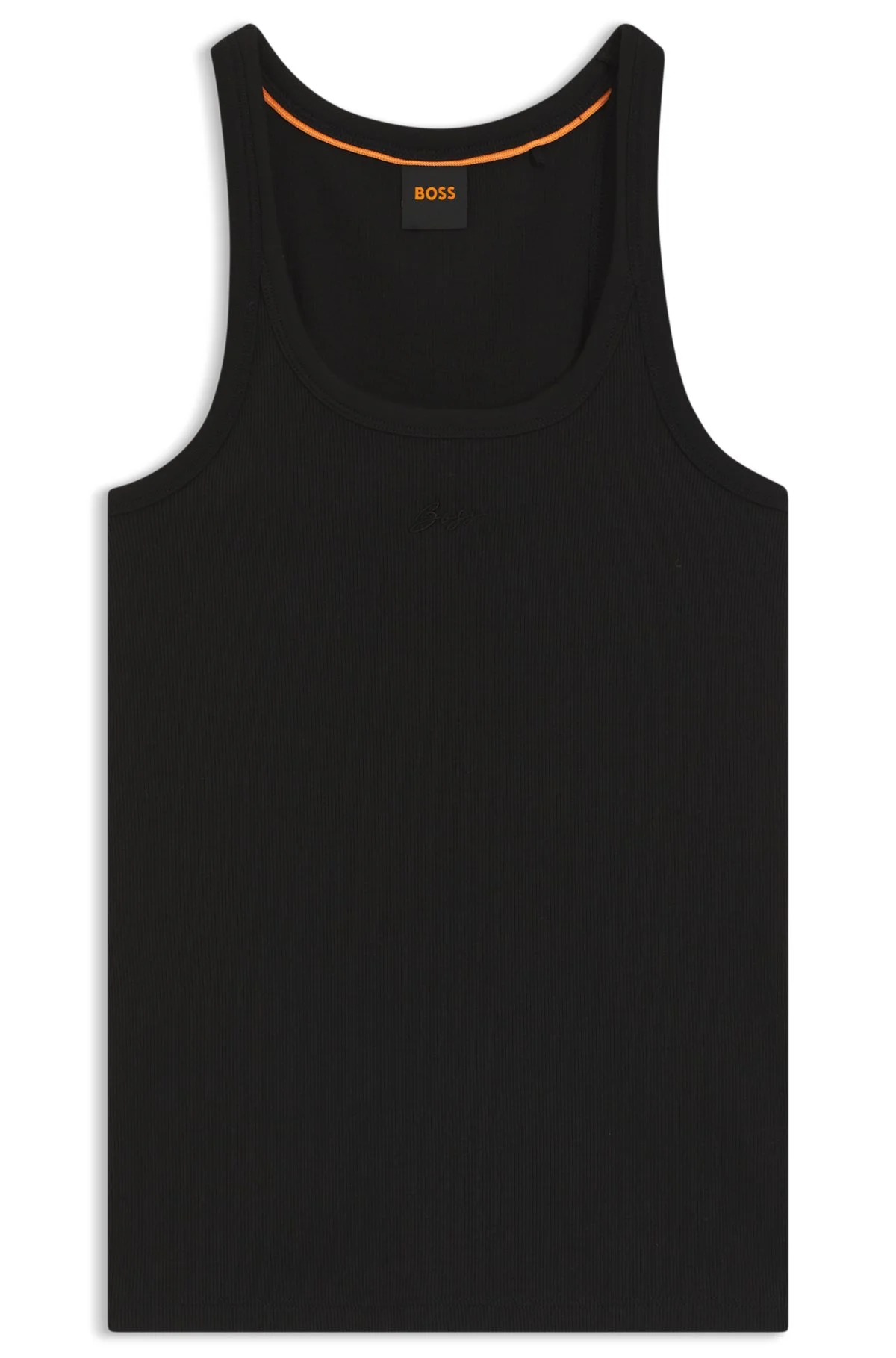 DETAILS Create a variety of everyday looks with this form-fitting BOSS Womenswear tank top. Comfortable stretch cotton with a ribbed structure. Handwritten embroidered logo. Slim fit Neckline: Scoop neck Sleeveless C_Epetite - 50554664 QUALITY & CARE INSTRUCTIONS Machine Wash Cold Gentle Do Not Bleach Do Not Tumble Dry Reduced Dry Clean Iron Low Heat Material: 98% Cotton, 2% Elastane, Ribbing: 97% Cotton, 3% Elastane