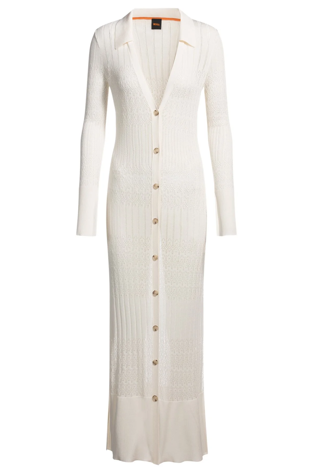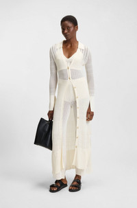 DETAILS C_Flooney - 50535494 Featuring side slits, this BOSS Womenswear cardigan is knitted with intricate structures. Button front and logo charm. Layer it with the matching top and trousers. Fit back length: 124 cm (49 inches) QUALITY & CARE INSTRUCTIONS Hand Wash Only Reduced Dry Clean Do Not Bleach Quality: 72% materialcode.RVI, 28% Polyamid Iron Low Heat Do Not Tumble Dry