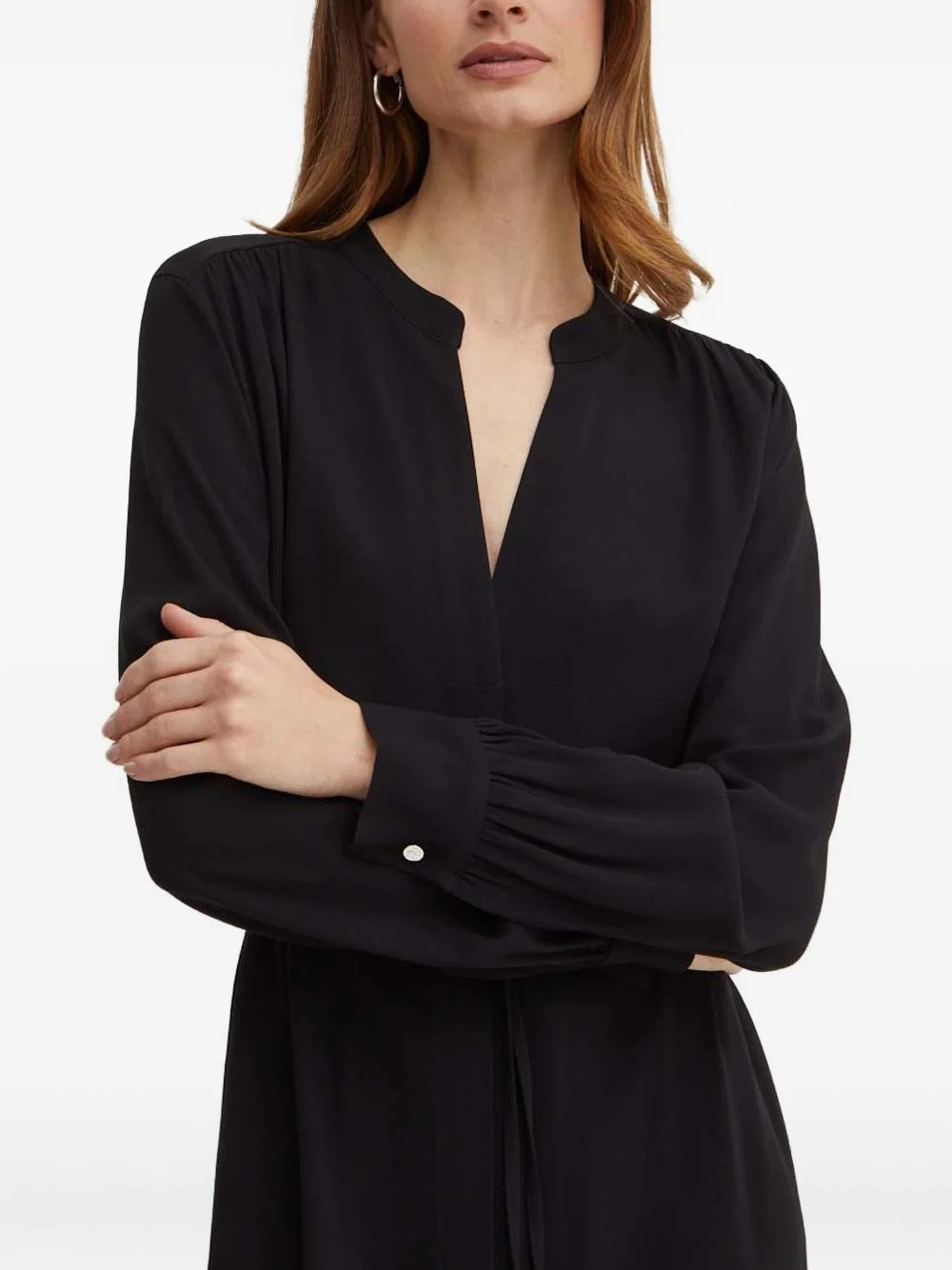 long-sleeve belted midi dress Highlights - Black - V-neck - Long sleeves - Belted waist - Midi length - Curved hemline Imported Composition Viscose 100% Washing instructions Read Manufacturer Guidelines