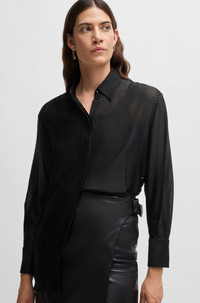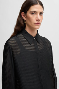 SIZE AND FIT The model wears a size 4 and is 5'9" tall with a, 33" chest, 25" waist and 35" hips. DETAILS Baredana2 - 50528552 A modern blouse in a loose fit by BOSS. This chic piece features a concealed placket and a diagonal stripe with a sheer burnout effect. Oversized fit Point collar Fastening top: Concealed closure Long sleeves Button cuffs Fit back length: 74 cm (29 inches) QUALITY & CARE INSTRUCTIONS Iron Low Heat Do Not Wash Quality: 52% Viscose, 48% Polyester Reduced Dry Clean Do Not Bleach Do Not Tumble Dry