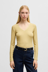 SIZE AND FIT The model wears a size S and is 5'10" tall with a, 31" chest, 24" waist and 35" hips. DETAILS Ellerson - 50532052 A versatile top with a V neckline, by BOSS Womenswear. This long-sleeved piece is crafted in lustrous stretch jersey with a ribbed structure. QUALITY & CARE INSTRUCTIONS Iron Low Heat Hand Wash Only Do Not Bleach Quality: 97% Viscose, 3% Elastane Do Not Tumble Dry Do Not Dry Clean