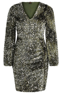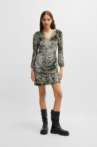 SIZE AND FIT The model wears a size S and is 5'10" tall with a, 33" chest, 24" waist and 35" hips. DETAILS C_Dailetta - 50519421 A feminine long-sleeved dress by BOSS. Crafted in soft velour, this distinctive piece features gathered details and a V neckline. Regular fit Long sleeves Elasticized cuffs Fully lined QUALITY & CARE INSTRUCTIONS Quality: 100% Polyester, Lining: 96% Polyester, 4% Elastane Do Not Bleach Do Not Tumble Dry Hand Wash Only Dry Clean Only Iron Low Heat