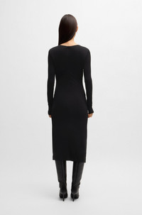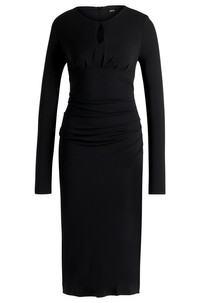 SIZE AND FIT The model wears a size S and is 6'2" tall with a, 34" chest, 28" waist and 37" hips. DETAILS Edeni - 50528622 A modern dress with long sleeves by BOSS. Featuring a distinctive keyhole neckline and flattering gathered details, this piece is crafted in matte jersey to create an elegant drape. A rear slit allows for ease of movement. Neckline: Crew neck Fastening top: Zip closure Long sleeves Back slit Fully lined QUALITY & CARE INSTRUCTIONS Reduced Dry Clean Do Not Bleach Cold, gentle machine wash; reduced spin speed. Quality: 100% Viscose, Lining: 86% Polyamid, 14% Elastane Do Not Tumble Dry Iron Low Heat