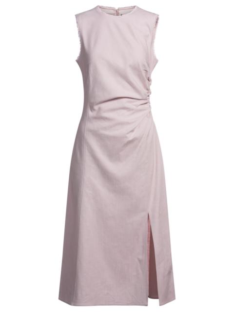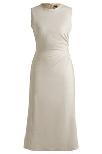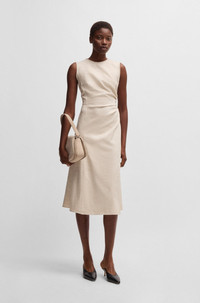 SIZE AND FIT The model wears a size 4 and is 5'10" tall with a, 31" chest, 24" waist and 35" hips. DETAILS Dianah - 50537879 This BOSS Womenswear dress makes a contemporary business look. Woven in melange fabric with stretch for a refined drape, with a gathered side and front slit for a flattering silhouette. Frayed edges add softness to the design. This product is made with cellulose fibres, derived from natural raw wood material and sourced from responsibly managed forests. We cooperate with external organisations to ensure respectful treatment of virgin and endangered forests. Fit back length: 115 cm (45 inches) QUALITY & CARE INSTRUCTIONS Quality: 99% Viscose, 1% Elastane, Lining: 64% Viscose, 36% Polyester Do Not Tumble Dry Do Not Bleach Do Not Wash Iron Low Heat Reduced Dry Clean