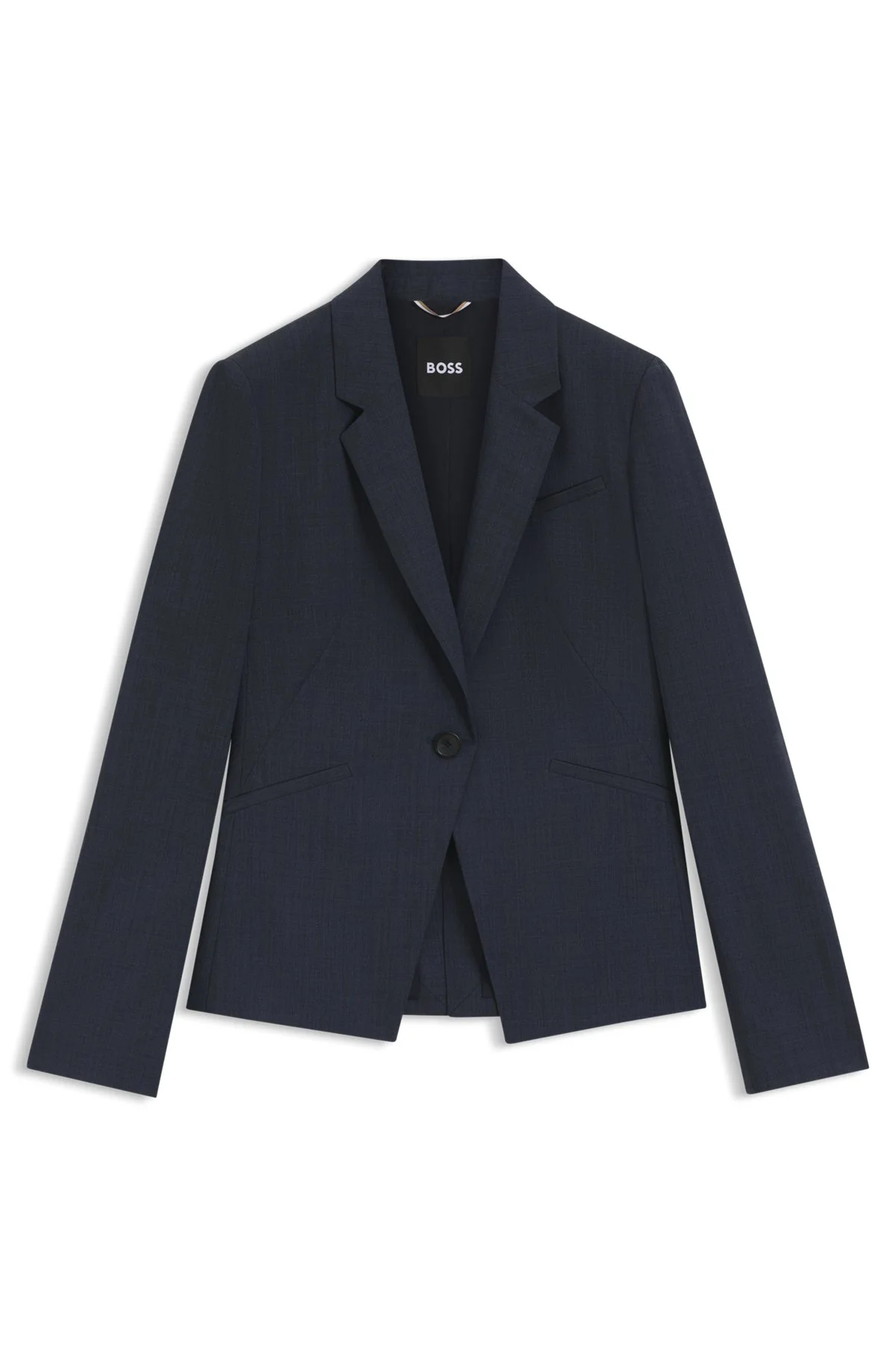 SIZE AND FIT The model wears a size 4 and is 5'9" tall with a, 32" chest, 23" waist and 34" hips. DETAILS Crafted in melange virgin wool with natural stretch, this BOSS Womenswear blazer features a flattering one-button closure. Tailored to a clean slim fit. Slim fit Notched lapels Fastening top: Button closure Number of buttons: 1 Welt chest pockets Pockets top: Welt pockets Slit cuffs Fully lined Fit back length: 62 cm (24 inches) Jia9 - 50542010 QUALITY & CARE INSTRUCTIONS Do Not Tumble Dry Material: 100% Virgin wool, Lining: 64% Viscose, 36% Polyester Do Not Wash Do Not Bleach Reduced Dry Clean Iron Low Heat
