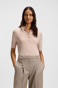 SIZE AND FIT The model wears a size M and is 5'10" tall with a, 33" chest, 23" waist and 34" hips. DETAILS The soft merino wool of this BOSS Womenswear sweater offers natural odor control as well as anti-pill performance. Straight fit with five-button placket. Regular fit Neckline: Polo collar Short sleeves Fidenka - 50545015 QUALITY & CARE INSTRUCTIONS Reduced Dry Clean Hand Wash Only Material: 100% Virgin wool, Ribbing: 79% Virgin wool, 18% Polyamid, 3% Elastane Do Not Tumble Dry Iron Low Heat Do Not Bleach