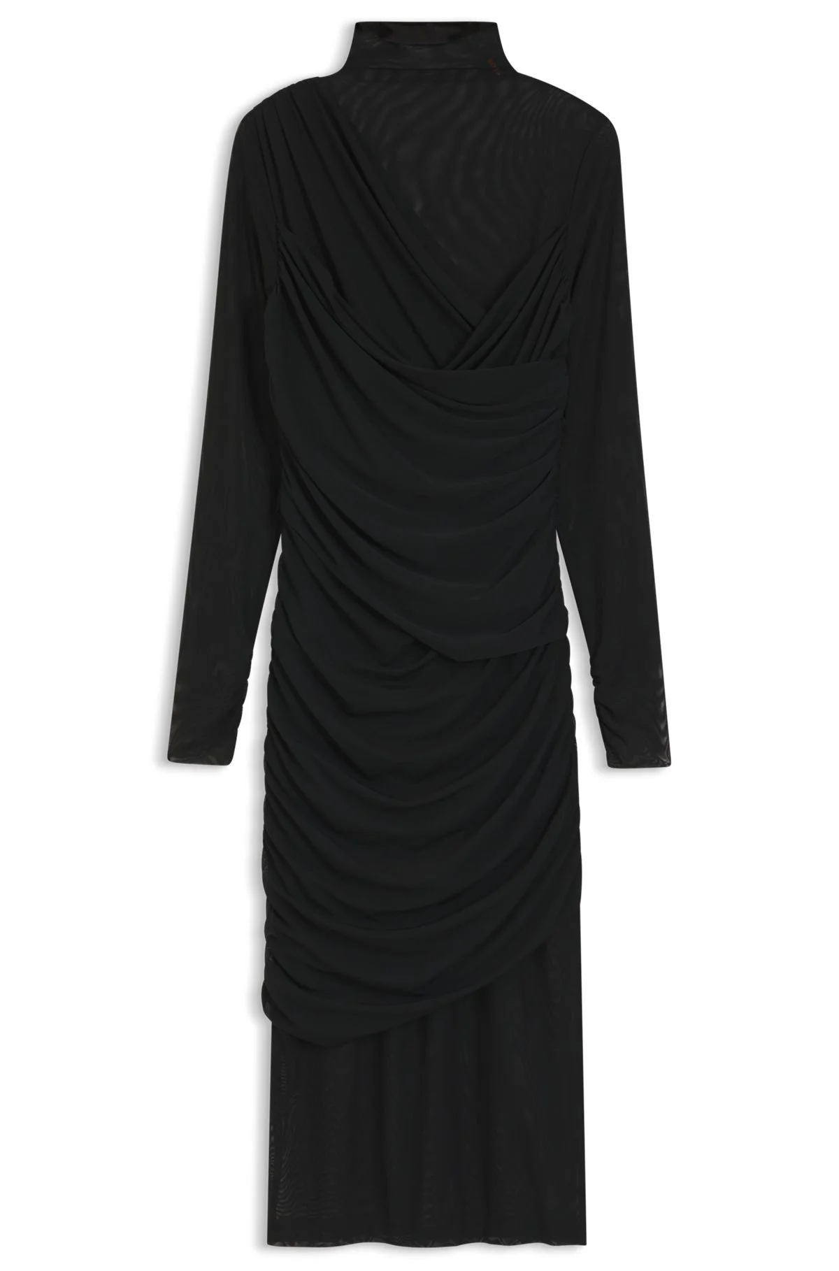 DETAILS Featuring draped, raw-cut mesh panels and gathered details, this BOSS Womenswear dress offers form-fitting, chic style. Turtleneck and coin logo trim. Slim fit Neckline: Turtleneck Long sleeves C_Etulia - 50553445 QUALITY & CARE INSTRUCTIONS Do Not Bleach Do Not Tumble Dry Cold, gentle machine wash; reduced spin speed. Do Not Dry Clean Iron Low Heat Material: 92% Polyamid, 8% Elastane, Lining: 100% Cotton