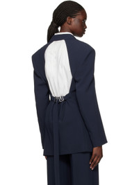 Plain-woven acetate- and viscose-blend blazer. · Notched lapel · Two-button closure · Welt pocket · Darts at waist · Flap pockets · Padded shoulders · Adjustable cinch strap and cutout at back · Partially elasticized back waistband · Partial satin lining Supplier color: Dark blue Body: 72% acetate, 28% viscose. Lining: 64% viscose, 36% polyester. Made in Turkey 241085F057004