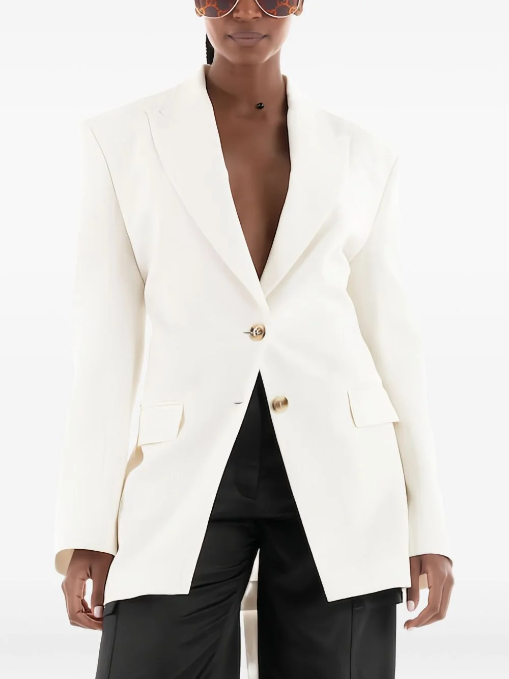open-back single-breasted blazer Highlights - Off-white - Single-breasted button closure - Open back - Padded shoulders - Peak lapels - Long sleeves Imported Composition Acetate 72%, Viscose 28% Washing instructions Read Manufacturer Guidelines