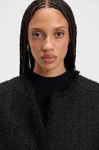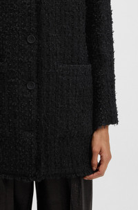 SIZE AND FIT The model wears a size 4 and is 5'10" tall with a, 29" chest, 23" waist and 33" hips. DETAILS With its collarless, oversize fit and rich velvet tweed, this BOSS Womenswear blazer offers a different way to do formals. Blended with cotton and wool. Oversized fit Fastening top: Button closure Number of buttons: 4 or more buttons Pockets top: Patch pockets Fully lined Fit back length: 84 cm (33 inches) Jokila - 50548309 QUALITY & CARE INSTRUCTIONS Do Not Tumble Dry Do Not Bleach Material: 50% Cotton (19% recycled), 16% Polyamid, 15% Polyester, 13% Polyacrylic, 5% Virgin wool, 1% Other fibres, Lining: 55% Polyester, 45% Viscose Do Not Wash Reduced Dry Clean Iron Low Heat
