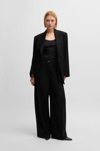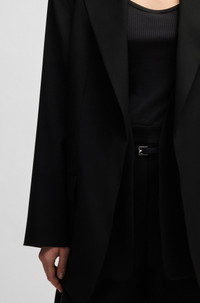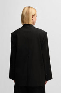 DETAILS Jaleda - 50537387 In a solid weave for adaptable styling, this BOSS Womenswear blazer is a versatile investment. Boxy fit with a clean edge-to-edge front. Oversized fit Notched lapels Fastening top: Open front Welt chest pockets Pockets top: Flap pockets Button cuffs Back vent Fully lined Fit back length: 76 cm (30 inches) QUALITY & CARE INSTRUCTIONS Do Not Tumble Dry Do Not Bleach Quality: 100% Virgin wool, Lining: 64% Viscose, 36% Polyester Do Not Wash Iron Low Heat Reduced Dry Clean