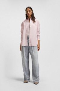 DETAILS C_Bostaffa - 50543546 Cut to a loose fit in breathable cotton, this BOSS Womenswear blouse has a modern cross pleat at the back. Embroidered logo detail at sleeve. Oversized fit Point collar Long sleeves Button cuffs QUALITY & CARE INSTRUCTIONS Do Not Tumble Dry Do Not Dry Clean Do Not Bleach Machine Wash Cold Quality: 100% Cotton Iron Low Heat