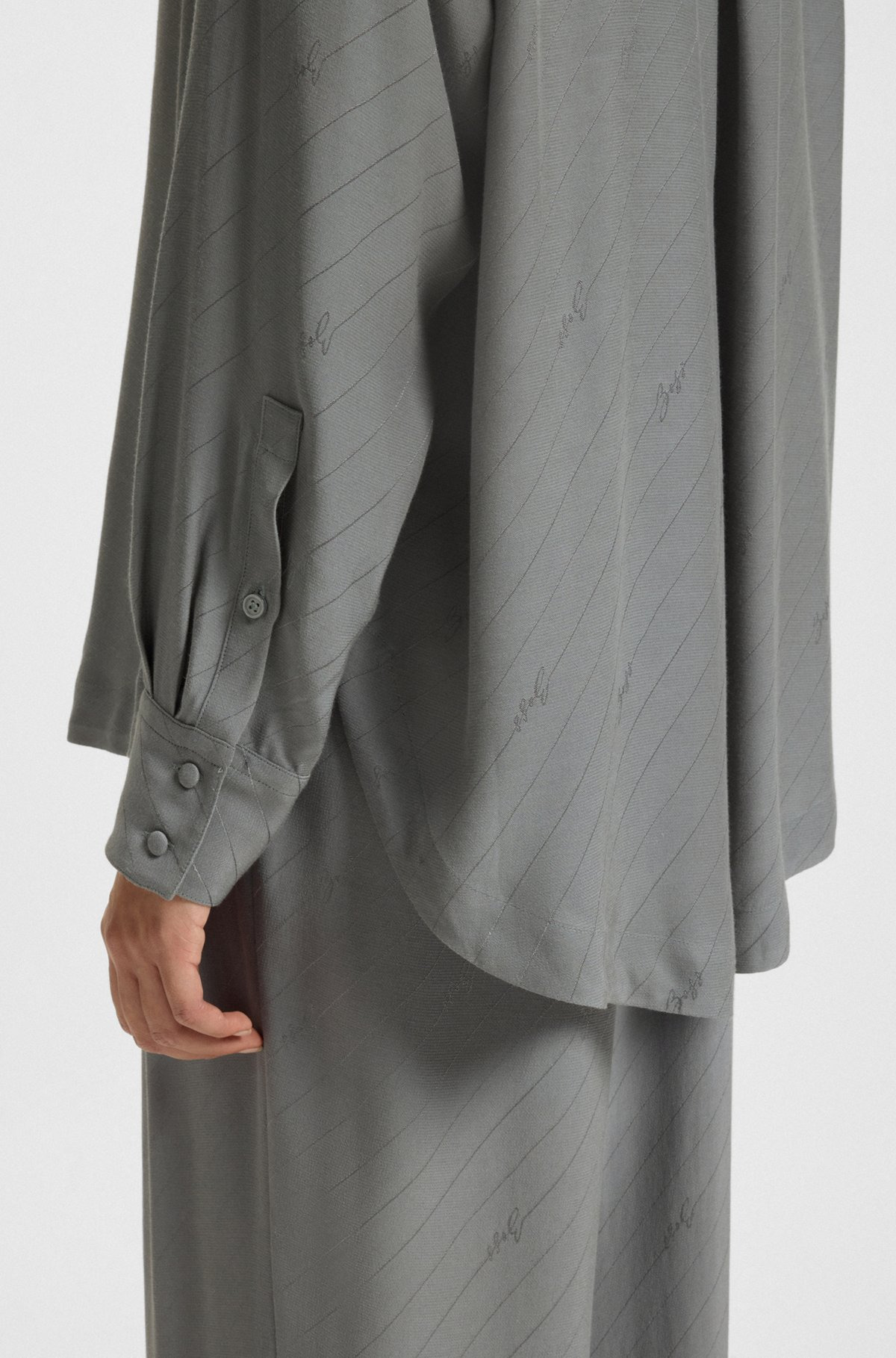 SIZE AND FIT The model wears a size 4 and is 5'9" tall with a, 31" chest, 23" waist and 35" hips. DETAILS C_Bosciarpa - 50544015 In an oversize fit with a rear pleat, this BOSS Womenswear blouse is loaded with detail. Fringe trims, logo jacquard and scarf accent. Oversized fit Point collar Long sleeves Barrel cuffs Fit back length: 75 cm (30 inches) QUALITY & CARE INSTRUCTIONS Iron Medium Heat Do Not Bleach Hand Wash Only Do Not Tumble Dry Quality: 100% Viscose Dry Clean Only