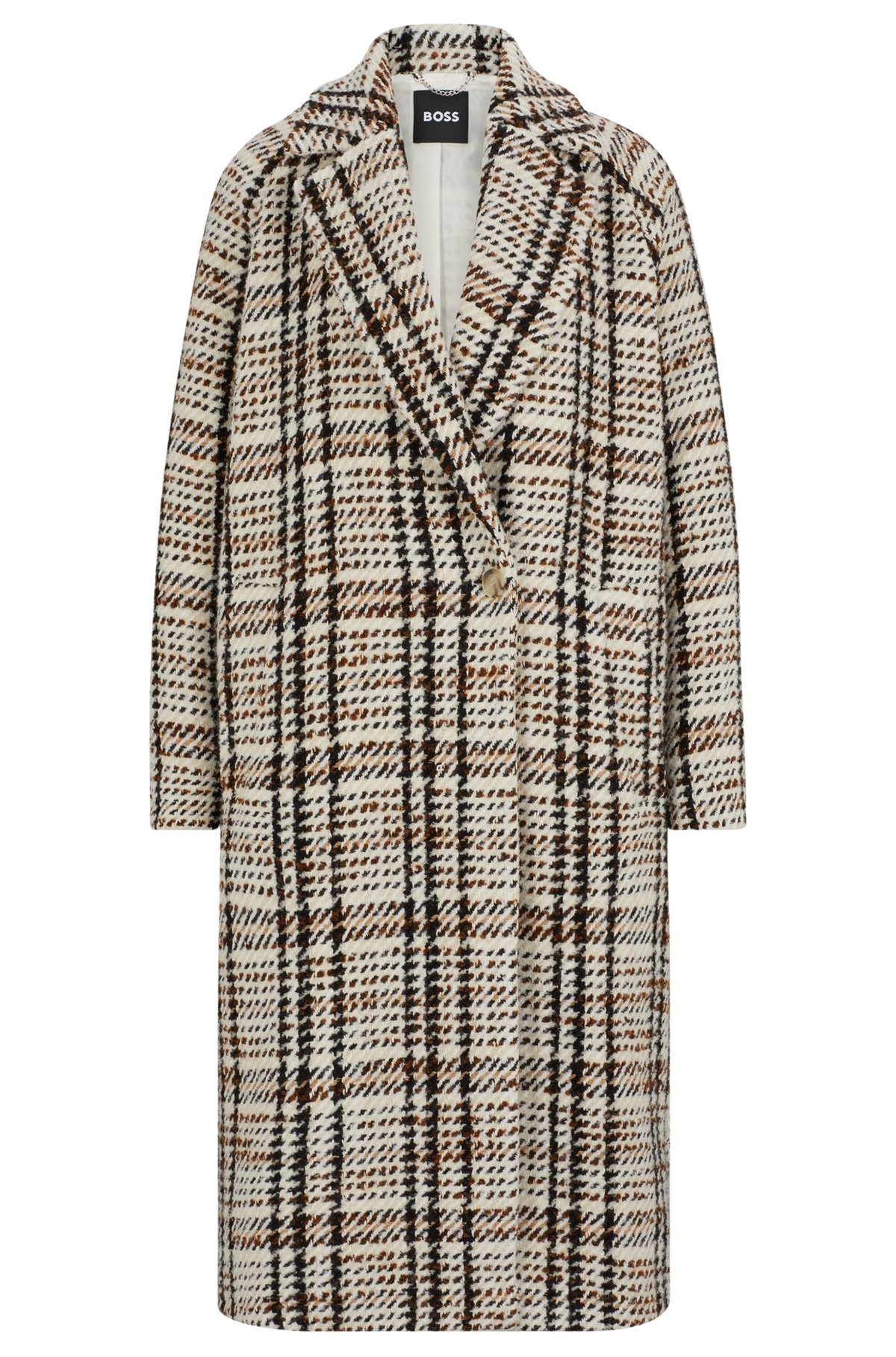 SIZE AND FIT The model wears a size 8 and is 6'2" tall with a, 36" chest, 28" waist and 37" hips. DETAILS Calorena - 50518890 A long-length oversize-fit coat by BOSS Womenswear. Patterned with a contemporary check, this piece comes in weighty fabric blended with soft wool. Oversized fit Oversized lapels Number of buttons: 1 Pockets top: Single welt pocket No cuffs No vent Fully lined Long length Fit back length: 114 cm (45 inches) QUALITY & CARE INSTRUCTIONS Quality: 59% Polyester, 18% Polyacrylic, 17% Wool, 4% Virgin wool, 2% Other fibres, Lining: 100% Viscose Do Not Tumble Dry Do Not Bleach Do Not Wash Iron Low Heat Reduced Dry Clean