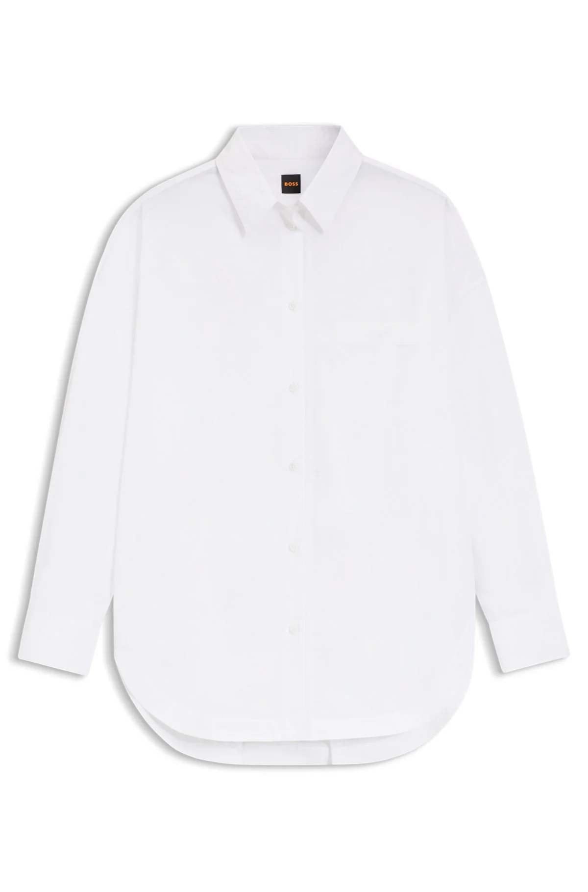 SIZE AND FIT The model wears a size 4 and is 5'9" tall with a, 31" chest, 24" waist and 35" hips. DETAILS Cut to a roomy fit, this BOSS Womenswear blouse combines soft cotton poplin with tonal organza for a modern effect. Embroidered logo. Oversized fit Point collar Long sleeves Button cuffs Patch chest pockets C_Bonsta - 50553532 QUALITY & CARE INSTRUCTIONS Do Not Dry Clean Iron Low Heat Do Not Tumble Dry Material: 100% Cotton, Sleeve lining: 100% Polyamid Do Not Bleach Hand Wash Only