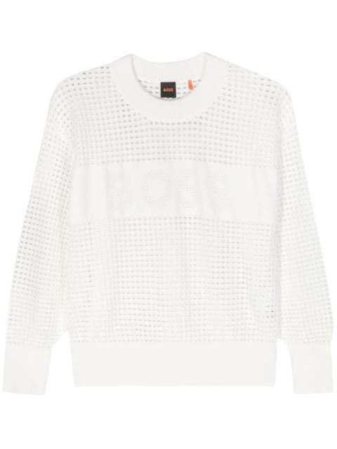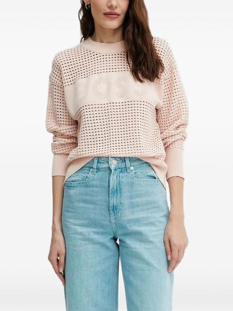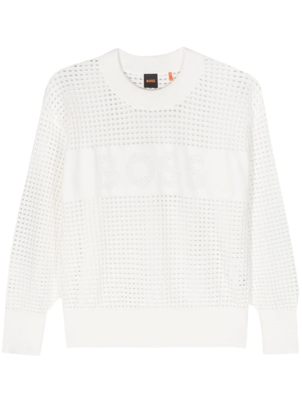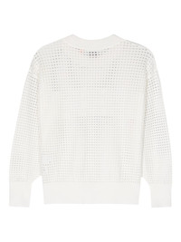 perforated-logo open-knit jumper Highlights - White - Stretch-design - Open knit - Semi-sheer construction - Perforated logo detail - Ribbed trim - Crew neck - Long sleeves - Straight hem - Unlined Imported Composition Viscose 70%, Polyester 30%