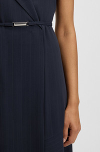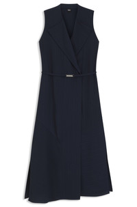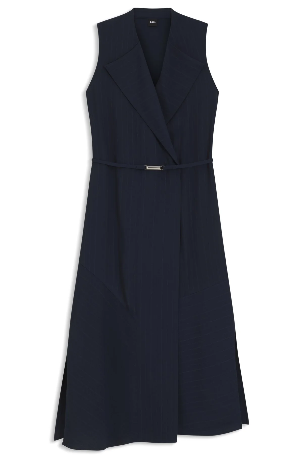 SIZE AND FIT The model wears a size 4 and is 5'8" tall with a, 29" chest, 22" waist and 35" hips. DETAILS Dimosa - 50548494 With its sleeveless styling and pinstripe pattern, this BOSS Womenswear dress is an instant classic. Drapey fabric with a belt detail and buttoned wrap front. Fit back length: 120 cm (47 inches) QUALITY & CARE INSTRUCTIONS Do Not Wash Reduced Dry Clean Do Not Tumble Dry Quality: 100% Viscose Do Not Bleach Iron Low Heat
