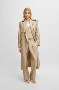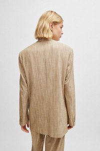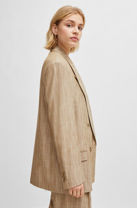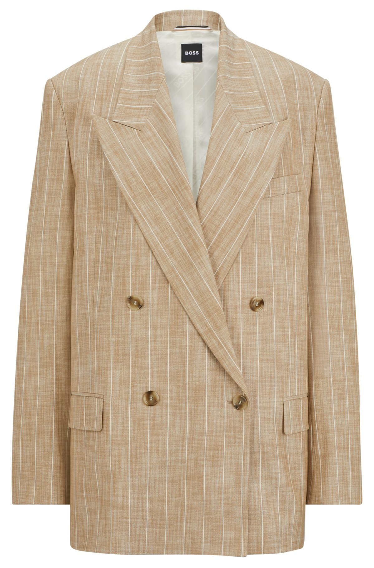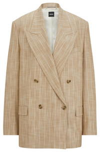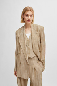 SIZE AND FIT The model wears a size 4 and is 5'10" tall with a, 31" chest, 24" waist and 34" hips. DETAILS Jusk - 50514828 A modern jacket with a double-breasted closure by BOSS Womenswear, crafted in pinstripe fabric blended with stretch and detailed with flap pockets. Fit back length: 79 cm (31 inches) QUALITY & CARE INSTRUCTIONS Iron Low Heat Quality: 83% Viscose, 14% Polyester, 3% Elastane, Lining: 54% Viscose, 43% Polyamid, 3% Elastane Do Not Wash Reduced Dry Clean Do Not Bleach Do Not Tumble Dry