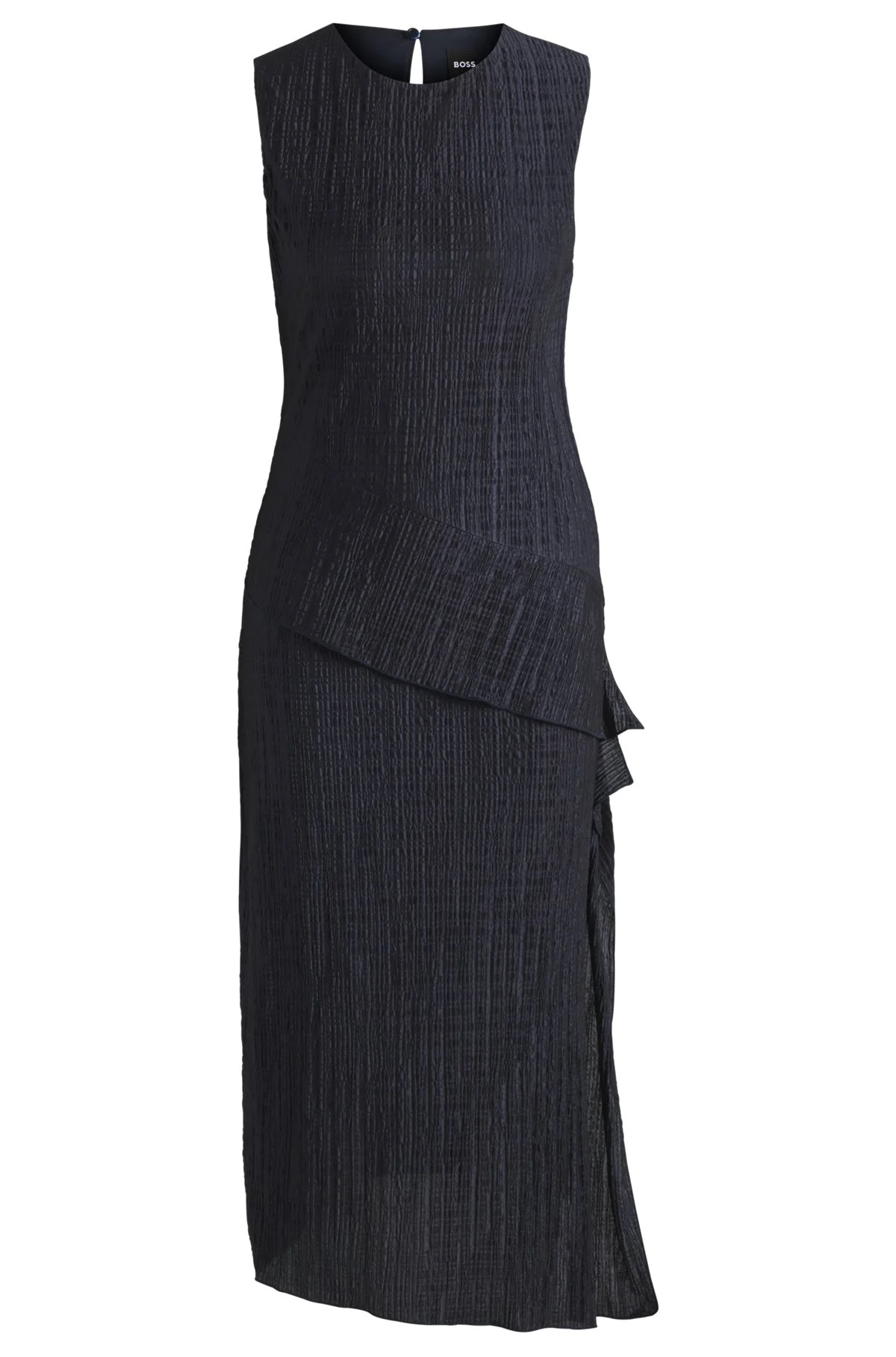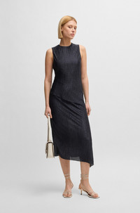 DETAILS Elanno - 50540848 This sleeveless BOSS Womenswear dress exudes modern elegance. Crafted in plisse material with a lustrous finish, this dress features layering at the skirt to ensure movement as you walk. An asymmetric hemline completes the contemporary silhouette. Regular fit Neckline: Crew neck Fastening top: Keyhole closure Number of buttons: 1 Sleeveless Fully lined Fit back length: 124 cm (49 inches) QUALITY & CARE INSTRUCTIONS Do Not Tumble Dry Iron Low Heat Do Not Bleach Machine Wash Cold Gentle Do Not Dry Clean Quality: 100% Polyester, Lining: 86% Polyester, 14% Elastane