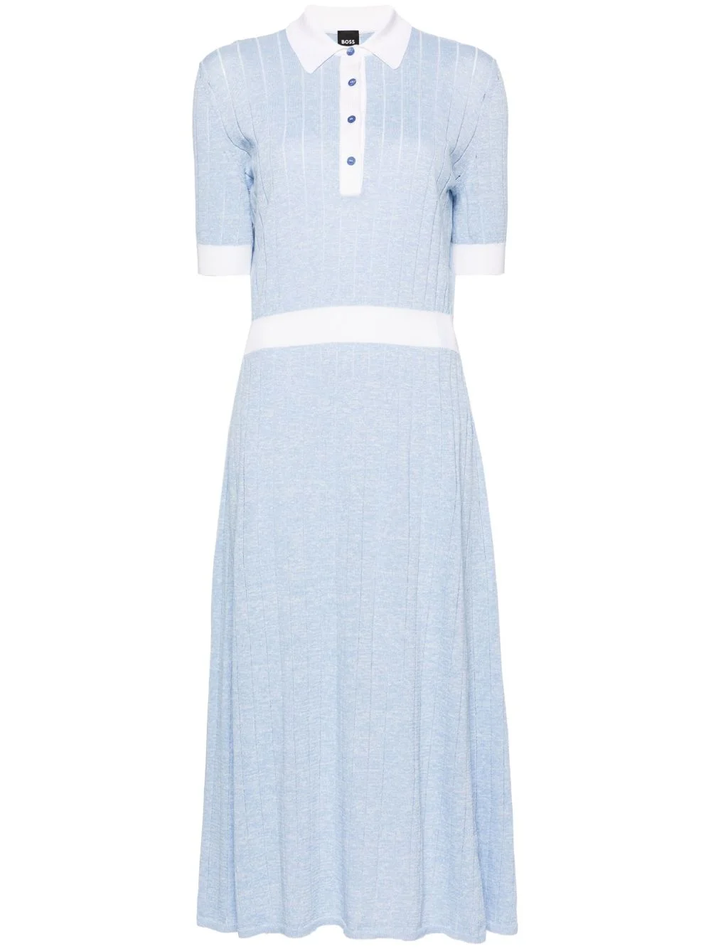 polo-collar fine-knit dress Highlights - Sky blue/white - Linen blend - Fine knit - Wide ribbed - Contrasting trim - Polo collar - Front button placket - Short sleeves - Ribbed cuffs - Ribbed waistband - Flared skirt - Unlined - Ribbed hem - Mid-length Imported Composition Outer: Viscose 96%, Linen/Flax 69%, Recycled Polyester 31%, Polyamide 4% Lining: Viscose 100% Washing instructions Hand Wash