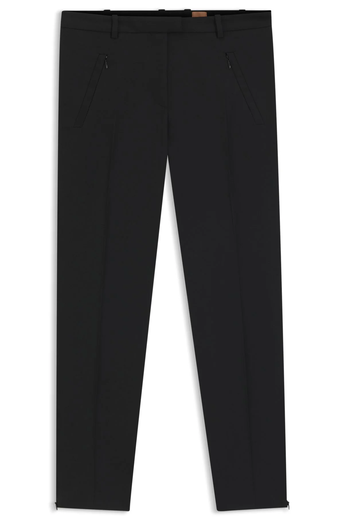 SIZE AND FIT The model wears a size 2 and is 5'9" tall with a, 31" chest, 24" waist and 35" hips. DETAILS Anaita5 - 50290225 These regular-rise trousers by BOSS Womenswear are crafted in stretch fabric with a hint of cotton and tailored to a slim fit with a cropped length. Slim fit Regular rise Hook and zip closure Slim leg Crease Pockets bottom front: Zip pockets Fit foot width: 29,0 cm (11.4 inches) QUALITY & CARE INSTRUCTIONS Quality: 77% Polyester, 20% Cotton, 3% Polyurethane, pocketing: 100% Cotton Dry Clean Only Do Not Tumble Dry Machine Wash Cold Do Not Bleach Iron Low Heat