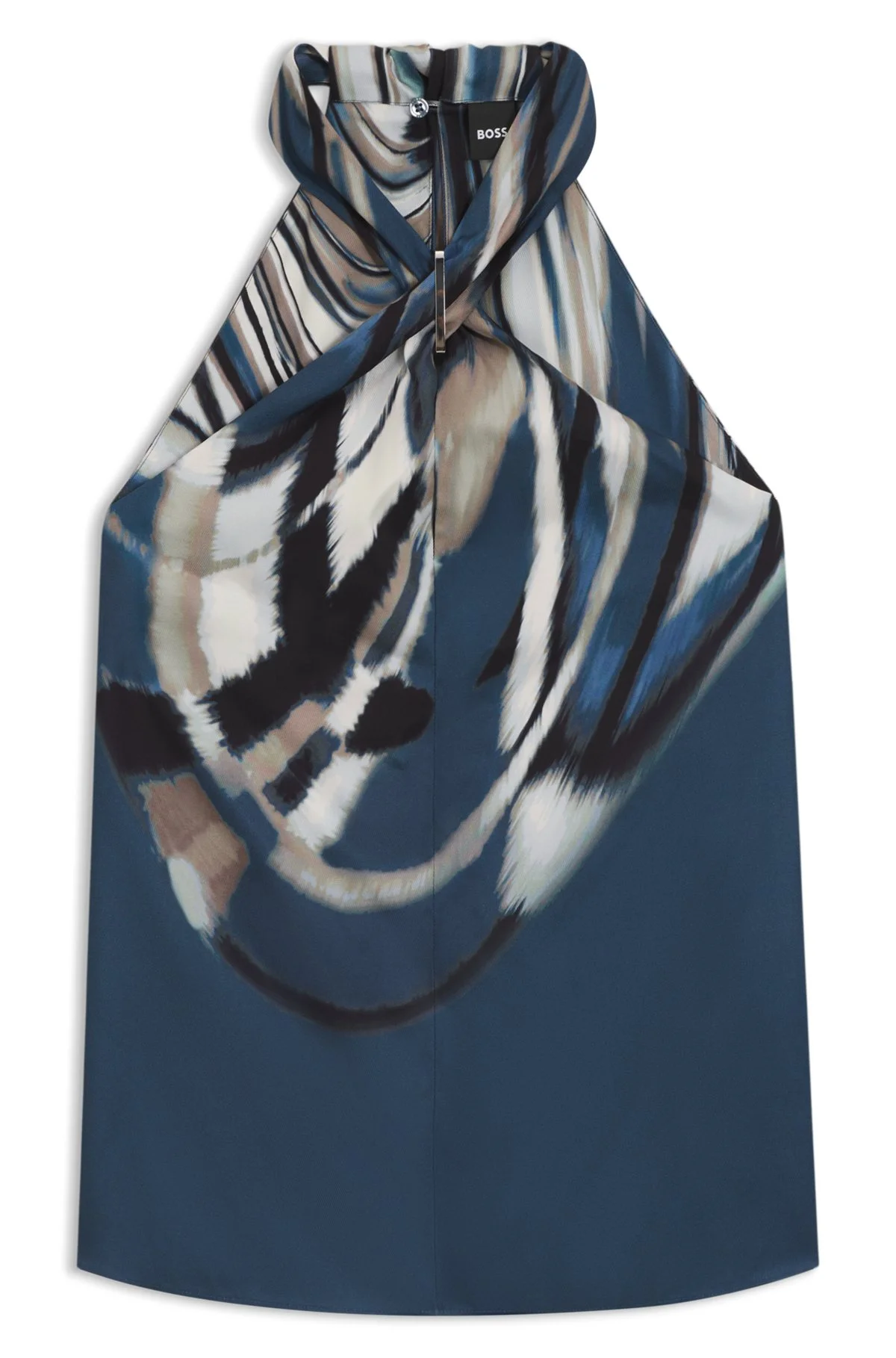 SIZE AND FIT The model wears a size 2 and is 5'9" tall with a, 31" chest, 24" waist and 35" hips. DETAILS Bonari - 50543187 With a swirl print on soft twill, this regular-fit BOSS Womenswear top makes a modern statement. Tie neckline with hardware trim. Regular fit Fastening top: Drawstring closure Sleeveless Fit back length: 65 cm (26 inches) QUALITY & CARE INSTRUCTIONS Do Not Wash Do Not Tumble Dry Dry Clean Only Do Not Bleach Iron Low Heat Quality: 100% Viscose