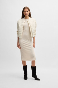 SIZE AND FIT The model wears a size 4 and is 5'10" tall with a, 33" chest, 24" waist and 35" hips. DETAILS C_Pikomba1 - 50531026 A modern bomber jacket with a water-repellent finish, by BOSS Womenswear. This zip-up design features patterned quilting and a logo badge. Fit back length: 55 cm (22 inches) QUALITY & CARE INSTRUCTIONS Iron Low Heat Do Not Wash very mild professional wet clean Quality: 100% Polyamide, Lining: 100% Polyamid, Collar: 44% Polyester, 30% Polyacrylic, 20% Polyamid, 6% Wool, Wadding: 100% Polyester, Cuff / Waistband: 48% Polyester, 26% Polyacrylic, 18% Polyamid, 5% Wool, 3% Elastane Do Not Bleach Do Not Tumble Dry Do Not Dry Clean