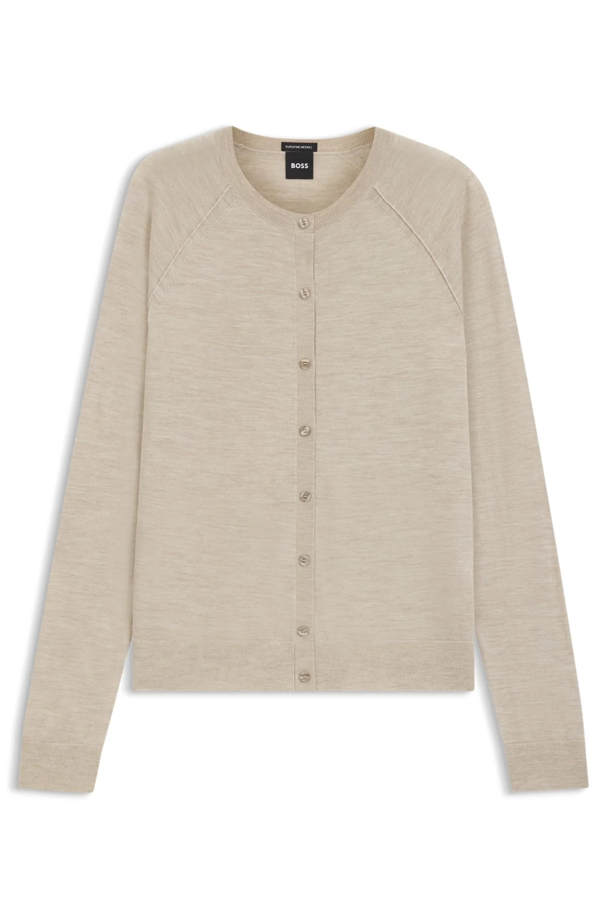 DETAILS Fonami - 50545031 Crafted in fine merino wool for natural breathability, this BOSS Womenswear cardigan has a super-soft feel. Lasting shape recovery. Resistant to pilling. Fit back length: 59 cm (23 inches) QUALITY & CARE INSTRUCTIONS Do Not Tumble Dry Reduced Dry Clean Quality: 100% Virgin wool Hand Wash Only Iron Low Heat Do Not Bleach