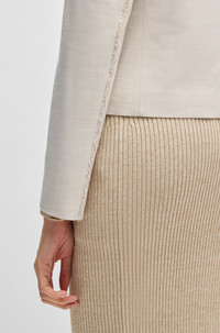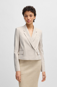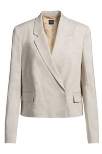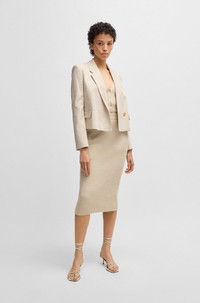 SIZE AND FIT The model wears a size 4 and is 5'10" tall with a, 31" chest, 24" waist and 35" hips. DETAILS Jaleto6 - 50537449 So easy to style, this BOSS Womenswear blazer has a straight, slightly cropped profile. Melange fabric with added stretch for comfort. Regular fit Fit back length: 53 cm (21 inches) QUALITY & CARE INSTRUCTIONS Iron Low Heat Do Not Wash Quality: 99% Viscose, 1% Elastane, Lining: 64% Viscose, 36% Polyester Reduced Dry Clean Do Not Bleach Do Not Tumble Dry
