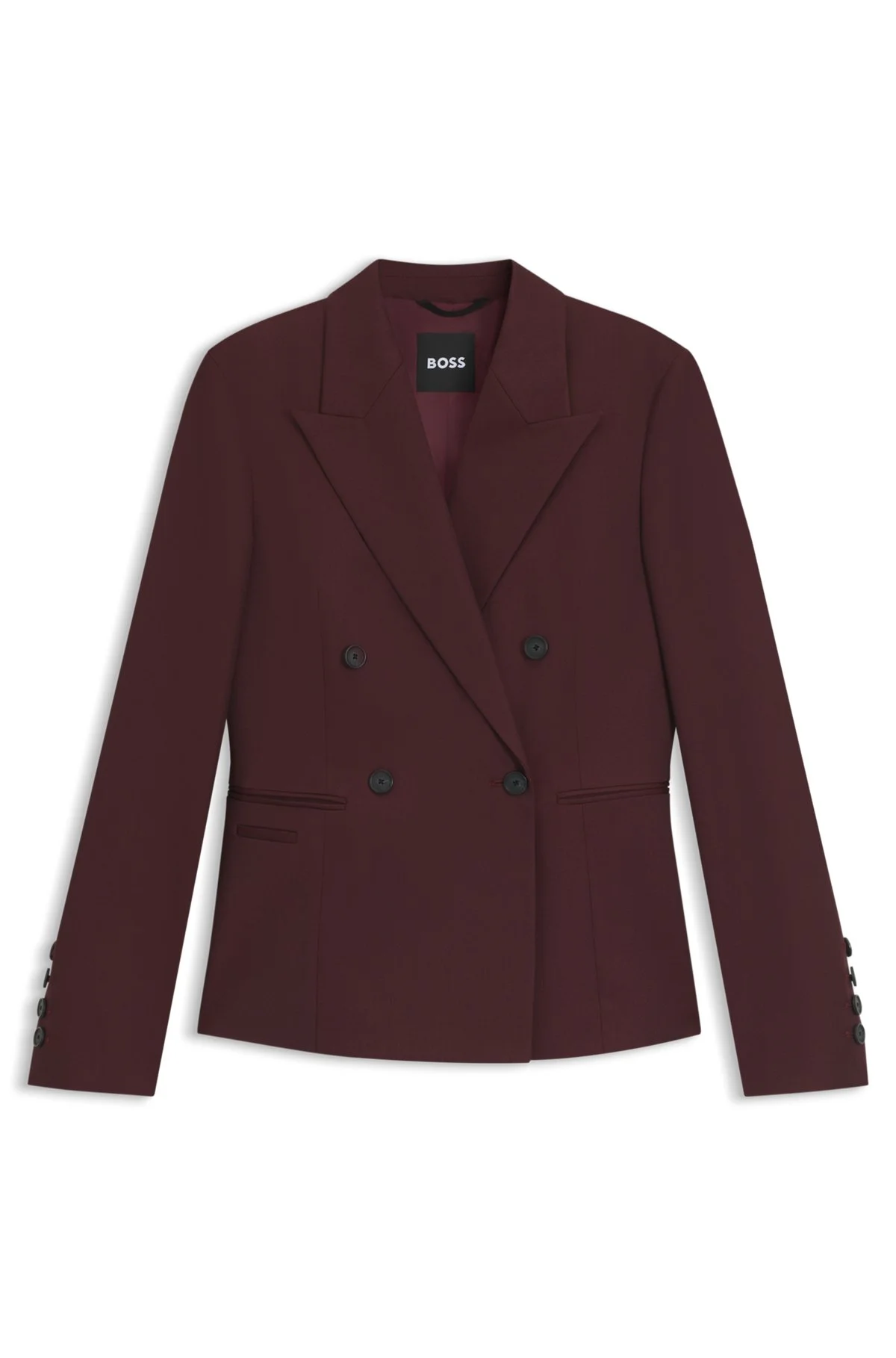 SIZE AND FIT The model wears a size 4 and is 5'11" tall with a, 31" chest, 23" waist and 34" hips. DETAILS With its clean fit and double-breasted closure, this BOSS Womenswear blazer strikes a confident formal note. Soft twill made from virgin wool. Slim fit Peaked lapels Fastening top: Button closure Number of buttons: Double-breasted Pockets top: Jetted pockets Kissing buttons on the cuff Fully lined Fit back length: 59 cm (23 inches) Jiamia - 50543280 QUALITY & CARE INSTRUCTIONS Iron Low Heat Do Not Tumble Dry Material: 100% Virgin wool, Lining: 55% Polyester, 45% Viscose Do Not Bleach Do Not Wash Reduced Dry Clean