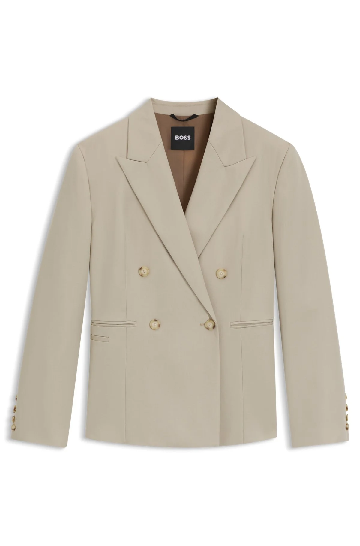 DETAILS Jiamia - 50543280 With its clean fit and double-breasted closure, this BOSS Womenswear blazer strikes a confident formal note. Soft twill made from virgin wool. Slim fit Peaked lapels Fastening top: Button closure Number of buttons: Double-breasted Pockets top: Jetted pockets Kissing buttons on the cuff Fully lined Fit back length: 59 cm (23 inches) QUALITY & CARE INSTRUCTIONS Reduced Dry Clean Do Not Tumble Dry Quality: 100% Virgin wool, Lining: 55% Polyester, 45% Viscose Do Not Bleach Iron Low Heat Do Not Wash