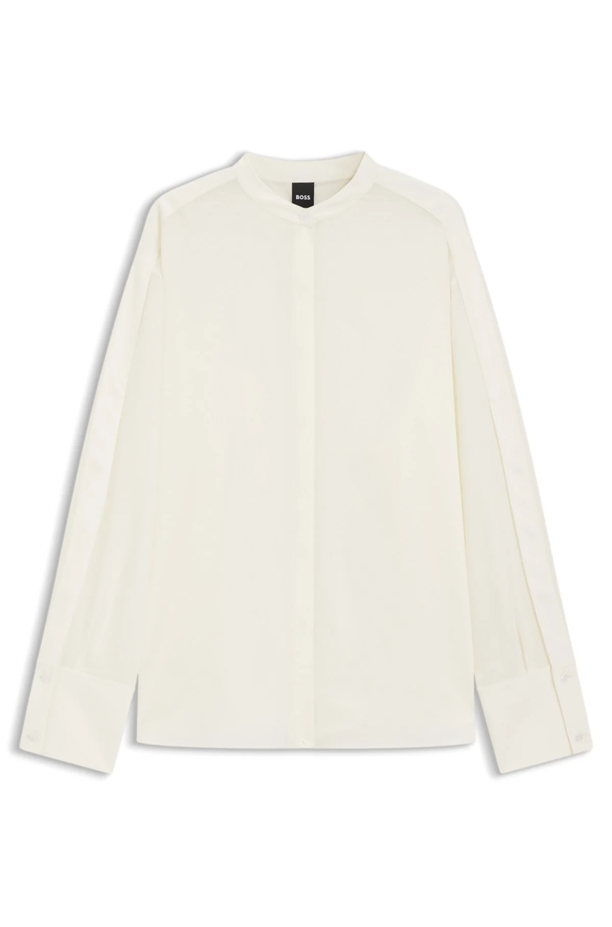 SIZE AND FIT The model wears a size 4 and is 5'9" tall with a, 32" chest, 23" waist and 35" hips. DETAILS With its mandarin collar and concealed closure, this BOSS Womenswear blouse is a cleanly styled option. Straight fit in fluid sandwashed silk. Versatile buttoned cuffs. Regular fit Stand collar Fastening top: Concealed closure Long sleeves Button cuffs Fit back length: 70 cm (28 inches) Boplin1 - 50554254 QUALITY & CARE INSTRUCTIONS Do Not Wash Do Not Bleach Do Not Tumble Dry Dry Clean Only Iron Low Heat Material: 100% Silk