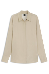 SIZE AND FIT The model wears a size 4 and is 5'9" tall with a, 31" chest, 24" waist and 35" hips. DETAILS Beruta1 - 50542007 Crafted in soft, fluid satin with an elegant sheen, this BOSS Womenswear blouse is a contemporary choice. Concealed closure Timeless straight fit. Regular fit Button-down collar Fastening top: Concealed closure Long sleeves Button cuffs QUALITY & CARE INSTRUCTIONS Cold, gentle machine wash; reduced spin speed. Do Not Tumble Dry Reduced Dry Clean Iron Low Heat Quality: 100% Viscose, Insert: 100% Viscose Do Not Bleach