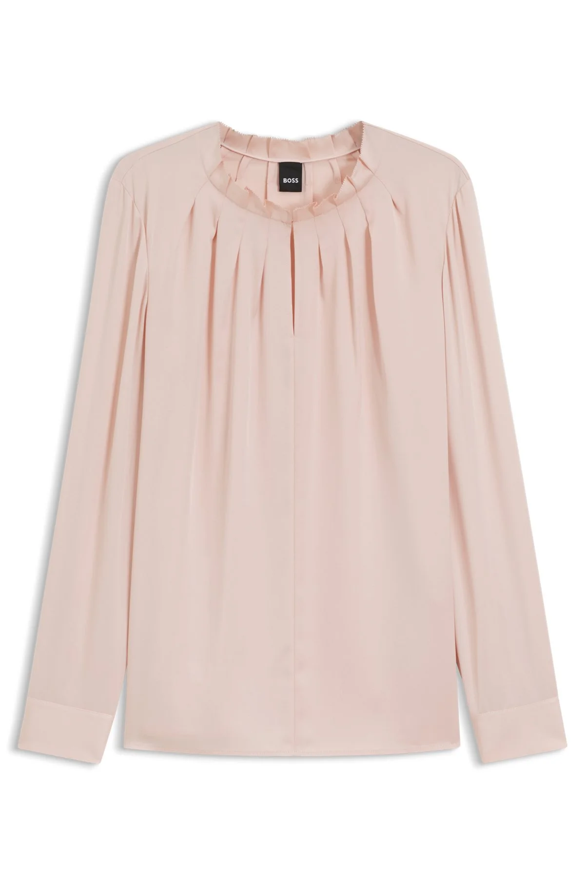 SIZE AND FIT The model wears a size 4 and is 5'10" tall with a, 31" chest, 24" waist and 34" hips. DETAILS Banorah1 - 50548224 With a keyhole detail and gatherings at the neckline, this tailored BOSS Womenswear blouse is a contemporary choice. Luxurious stretch silk. Straight fit. Regular fit Collarless Fastening top: Slip-on Long sleeves Button cuffs QUALITY & CARE INSTRUCTIONS Quality: 90% Silk, 10% Elastane Do Not Wash Do Not Bleach Reduced Dry Clean Do Not Tumble Dry Iron Low Heat